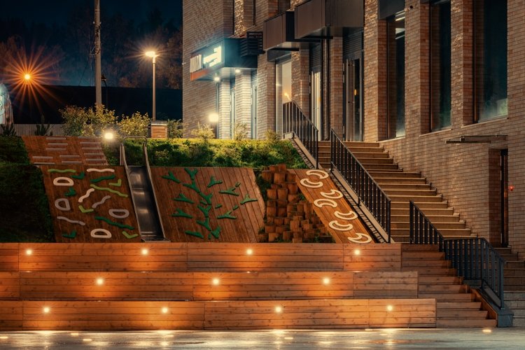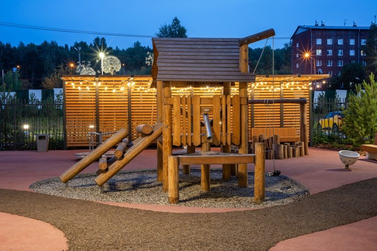 В дизайне фасада, детских площадок, помещений общественного пользования использованы натуральное дерево, камень, алюминиевые декоративные панели.